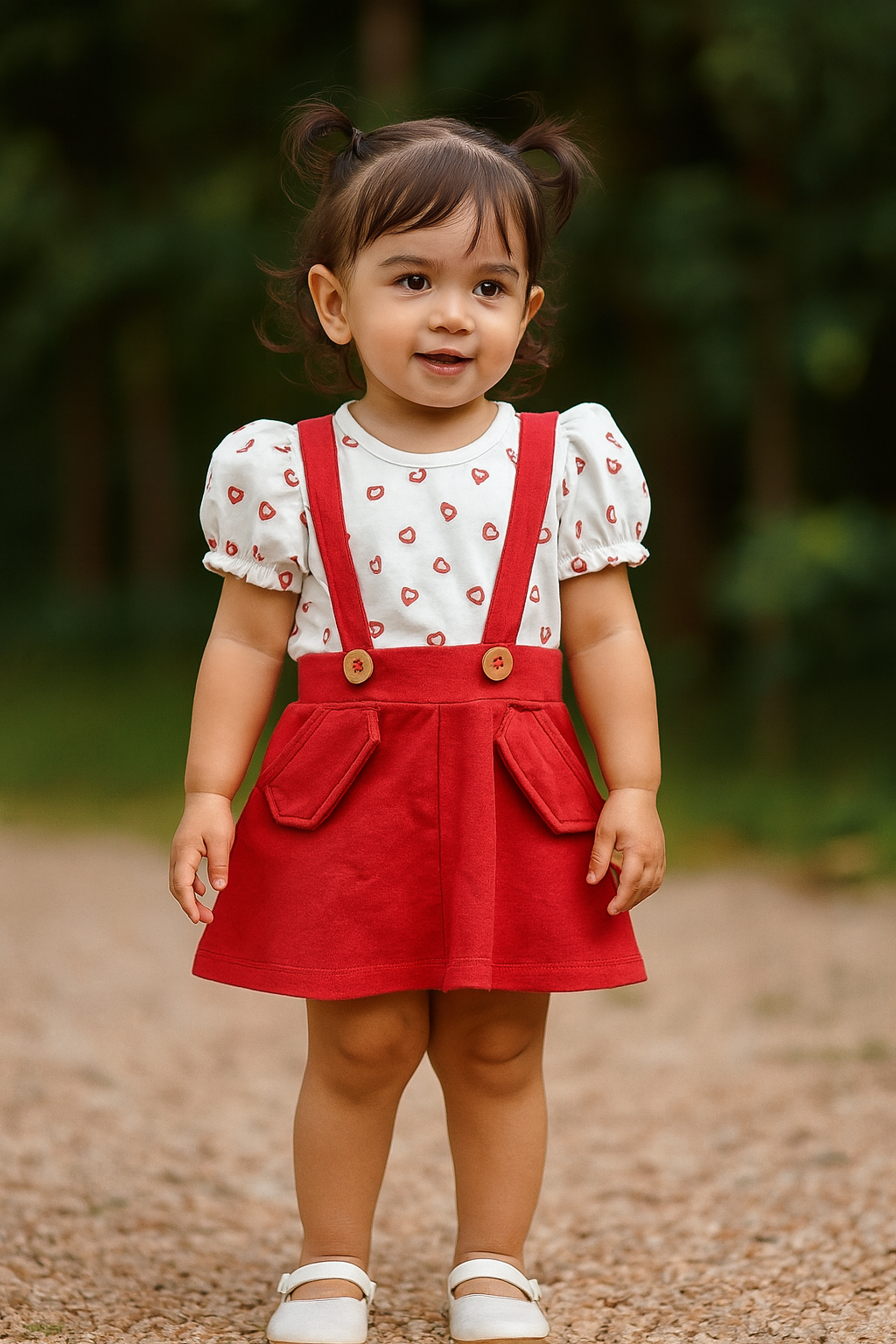 This pure cotton pinafore dress is a must-have for any small girl's wardrobe. The dress features a soft and durable fabric that will keep your little one comfortable all day long. With its classic design and top, this versatile dress is perfect for any occasion. Add a touch of style to your child's wardrobe today!