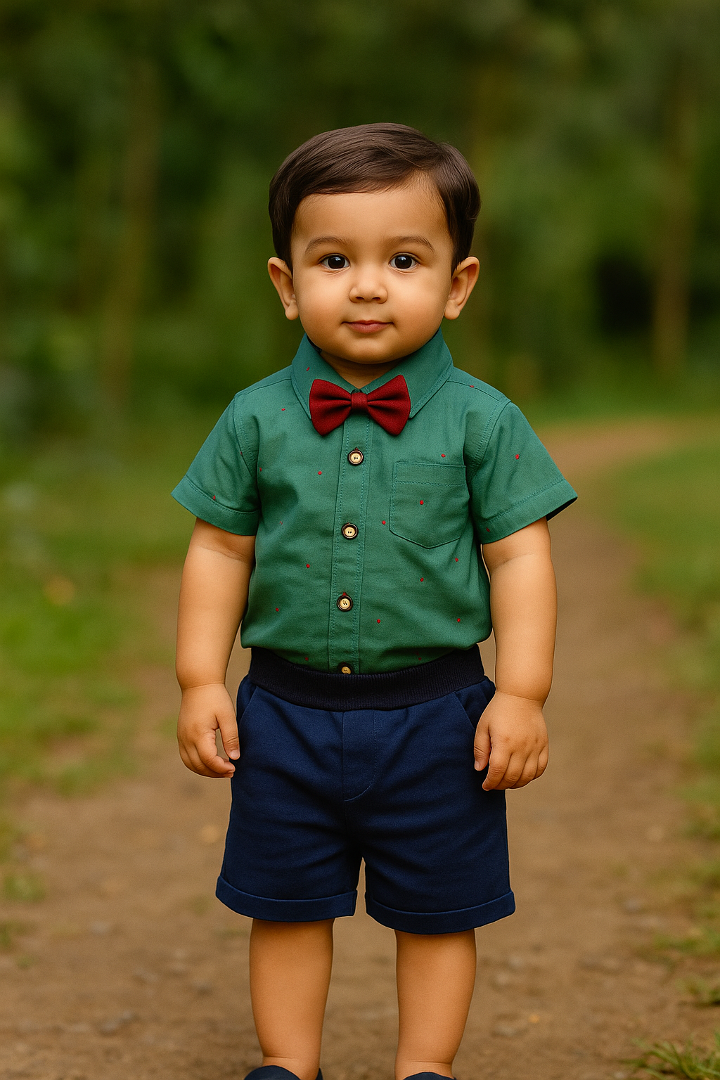 This green shirt with shorts and bow is perfect for any special occasion. Made with high-quality cotton, it offers comfort and style to your little boy's wardrobe. The shirt's bow adds a touch of elegance, making it an ideal party wear. Get your little one dressed to impress with this charming set.