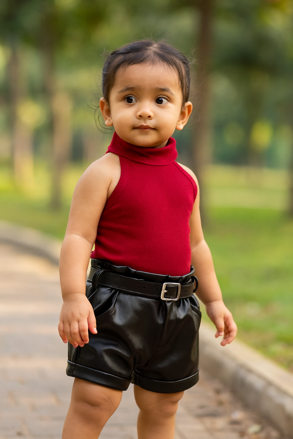 Crafted with a ribbed design, this off shoulder top and leather shorts with belt for toddlers are the perfect combination of style and comfort. The off shoulder top adds a touch of elegance while the leather shorts provide durability and the belt adds a cute finishing touch.