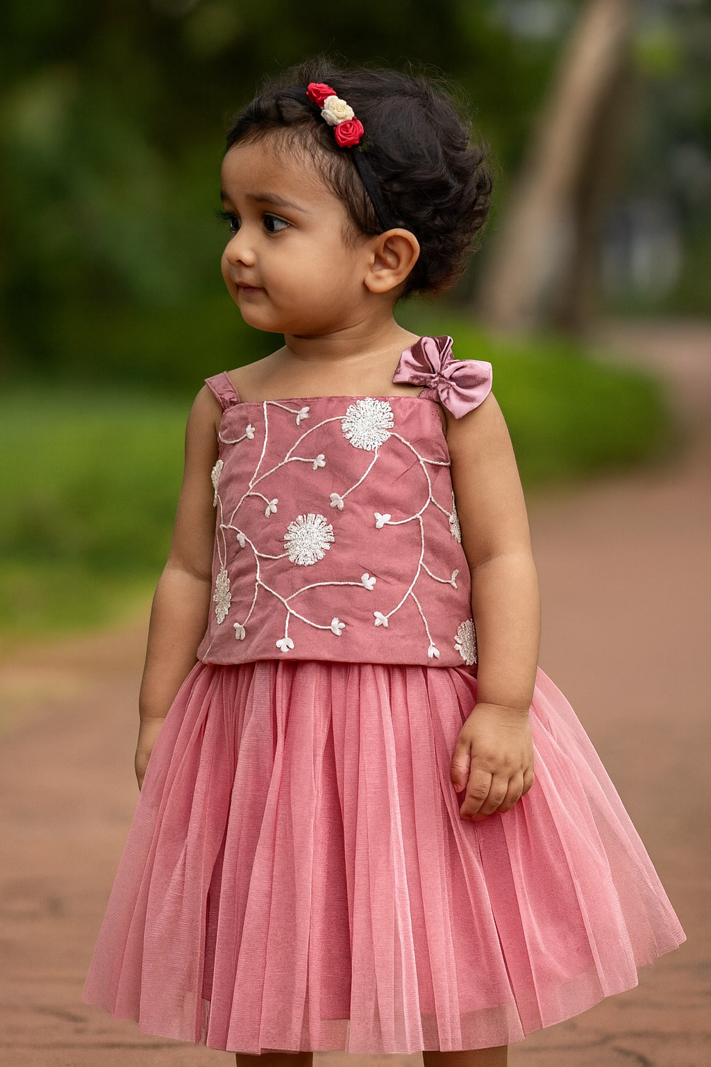 Introducing our stylish partywear set for kids - a gorgeous mauve pink net skirt and matching sleeveless top. Perfect for any occasion, this outfit is sure to make your child stand out in the crowd. Expertly crafted with attention to detail, our partywear set is a must-have for your little fashionista.